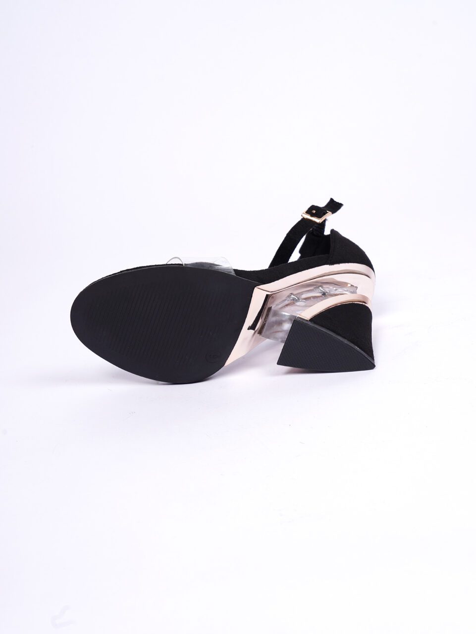 Sleek black wedge heels with minimalist clear straps for a modern, elegant look.