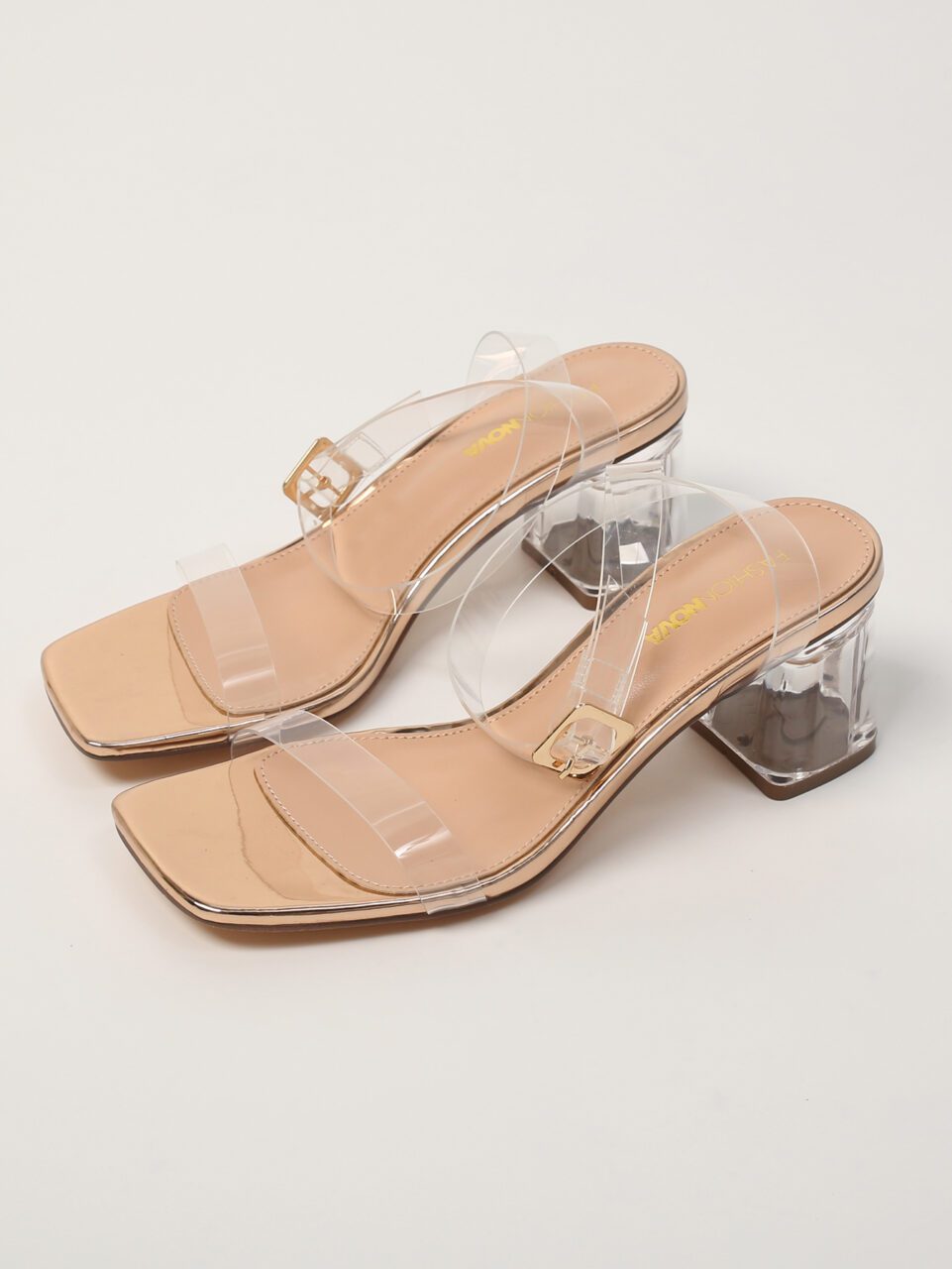 Elegant champagne wedge heels with clear straps for a modern, sophisticated look.