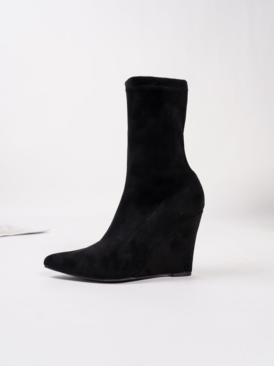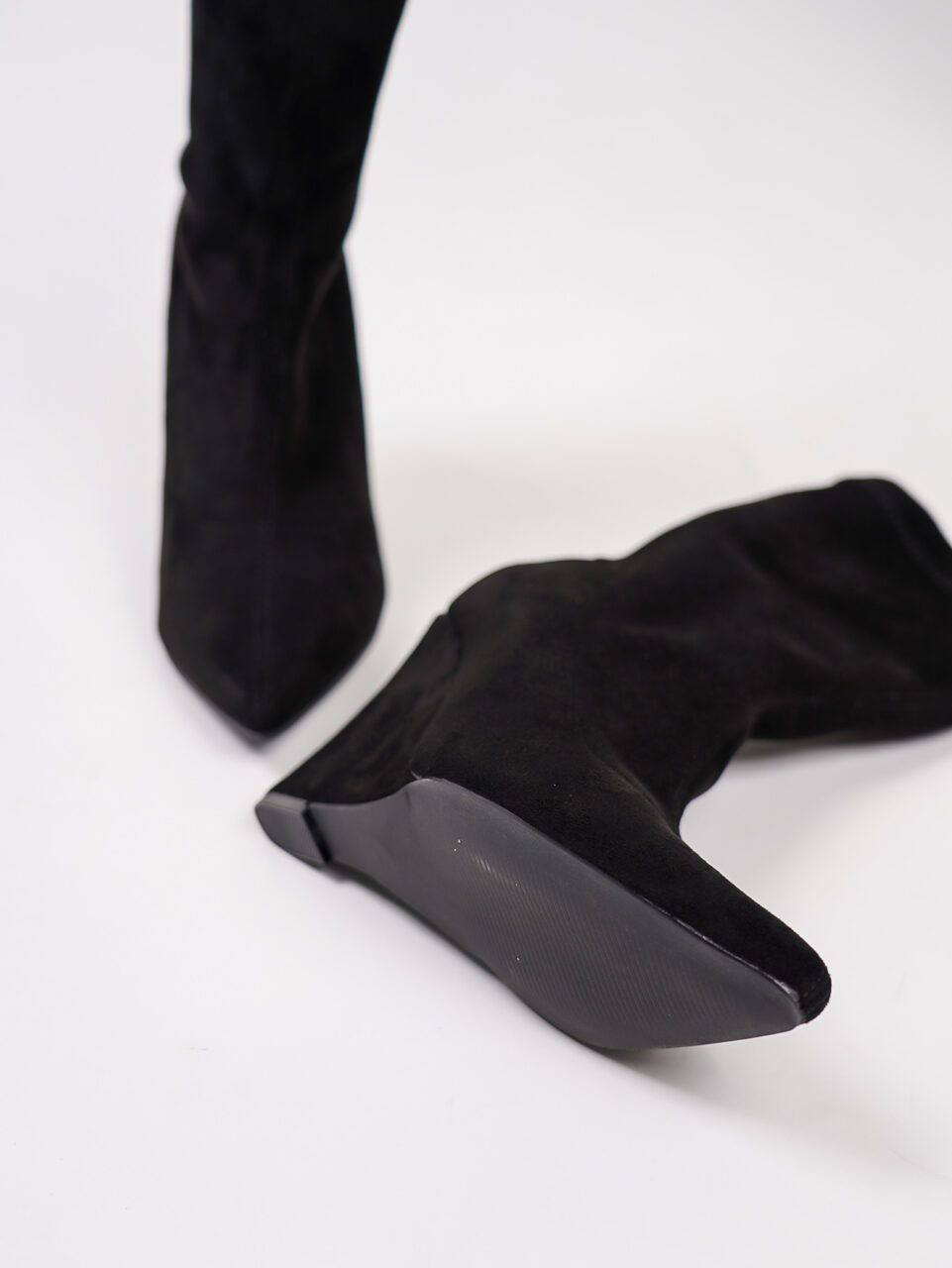 Sleek black mid-calf boots with stretch fabric for a comfortable and chic look.